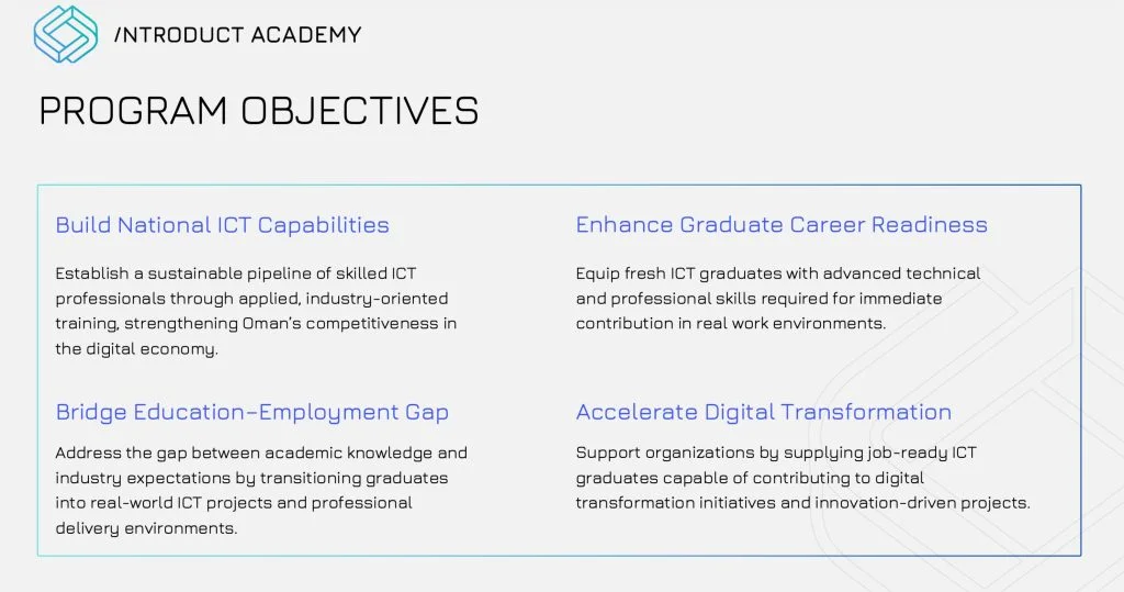 Our approach is to train and mentor students from this institution. As part of this partnership, students will join the Introduct Academy Oman program to gain real software experience before entering the job market.