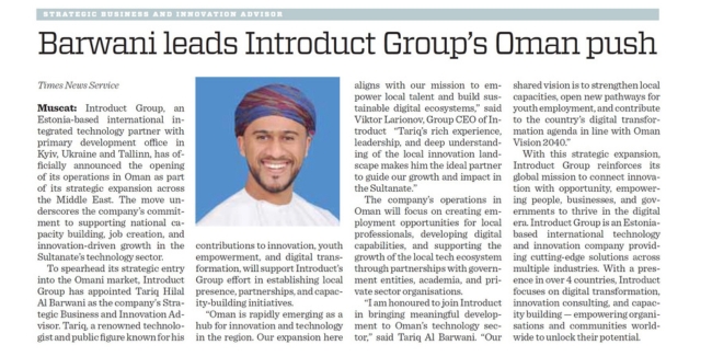 “Oman is rapidly emerging as a hub for innovation and technology in the region. Our expansion here aligns with our mission to empower local talent and build sustainable digital ecosystems,” said Viktor Larionov, CEO of Introduce Group. “Tariq’s rich experience, leadership, and deep understanding of the local innovation landscape make him the ideal partner to guide our growth and impact in the Sultanate.”