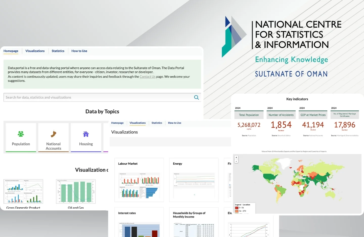 The National Centre for Statistics and Information (NCSI) Data Portal provides open government data for Oman, covering population, economy, housing, jobs, energy, and other national statistics. Citizens, researchers, businesses, and developers rely on the portal to access datasets, interactive dashboards, key indicators, and detailed reports — all free to use.
